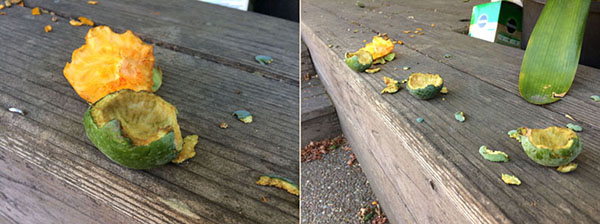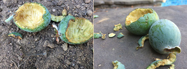 也不知是幾隻松鼠的傑作,更清楚是夜晚或清晨來偷食。來偷吃也就算了,竟然大擺姿態,公然把柿子、鳳梨芭樂搬到陽台的桌上、泳池乾淨的石塊上、木架上舒適的地方;享受起甜柿及鳳梨芭樂的美味。把果肉啃得乾乾淨淨後,留下殘皮拍拍屁股走掉了。偷吃也擦嘴,就是要讓主人知道它們來飽食過,剩下殘羹就請您們自己收拾吧!真是又氣又好笑。