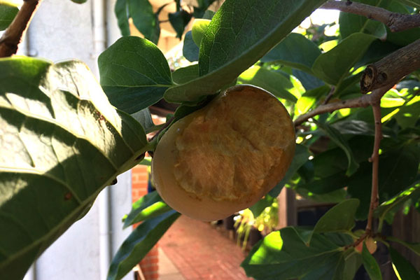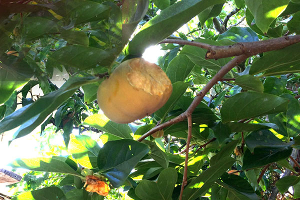 沒想到一直和平共處的松鼠,竟然作起怪來。原以為只吃堅果的松鼠,在柿子剛轉黄未十分熟時,已經等不及了每天䦕始試吃.把後院的柿子及鳳梨芭樂啃掉不少。慢慢的也視柿子及鳳梨芭樂為珍品,食髓知味天天來光顧。