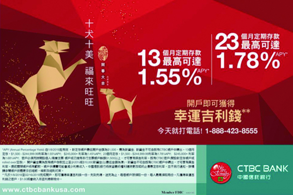 農曆新年快到了,今年狗年,中國信託銀行祝老中讀者十犬十美,福來旺旺。推出13個月定期存款,利息最高可達1.55%APY