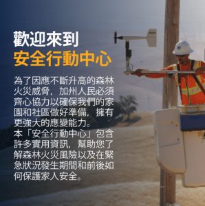 「安全行動中心可幫助每個人踏出重要的第一步,開始他們的安全旅程。」PG&E社區森林火災安全計劃副總裁Sumeet Singh說,「此網站提供視頻、互動功能與檢查清單,是為森林火災和緊急事件做準備以及重要安全資訊的一站式資源網站。」