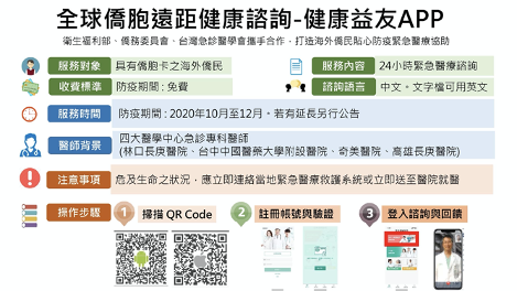 僑務委員會為照顧僑胞健康需求,攜手衛生福利部及臺灣急診醫學會,推出「全球僑胞遠距健康諮詢平臺」-健康益友APP。透過「健康益友」APP,臺灣的專業醫生群,將臺灣的醫療能量擴及海外僑胞,24小時守護全球僑胞的健康,讓僑胞可透過視訊與臺灣專業醫師面對面諮詢。目前共有超過500多位僑胞登錄APP,參與「健康益友」計畫的醫療人員有100多位,提供諮詢服務的醫師皆是來自林口長庚醫院、臺中中國醫藥大學附設醫院、臺南奇美醫院及高雄長庚醫院的急診專科醫師。希望此計畫能讓旅外僑胞、僑臺商及留學生「手機拿起來,就能感受到臺灣對他們的關心!」