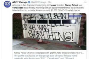 眾議院議長Nancy Pelosi在San Francisco一所住宅週五淩晨遭到破壞。塗鴉文字很顯然涉及到2000元COVID-19救濟金努力的失敗。