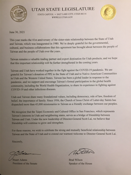 駐舊金山臺北經濟文化辦事處處長賴銘琪6月29日至7月1日出訪猶他州,拜會猶他州副州長韓得森,就持續加強經貿、教育交流等議題深入交換意見;並拜會州參議長亞當斯及州眾議長威爾遜,獲兩人頒予聯名聲明書,盼猶他州及臺灣持續強化友誼,並支持臺灣參與「世界衛生組織」(WHO)及國際衛生社群。