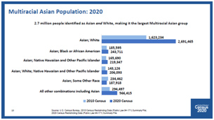 相比之下,亞裔混血人口增長了 55.5%。 2020 年約有 410 萬人被認定為亞裔混血,高於 2010 年的 260 萬人。約有270 萬人被認定為亞裔和白人,使其成為最大的多種族亞裔群體。