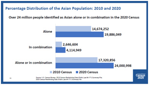 根據最近2020 年人口普查的重新劃分數據結果,亞洲特定人口顯著增加。超過 2400 萬人(佔總人口的 7.2%)認定自己為“亞洲人單獨或混血”。 ” “僅亞裔”是指只認定為亞裔而未報告任何其他種族的人。“亞洲單獨或混血”包括那些報告亞裔的受訪者,無論他們是否報告了任何其他種族。