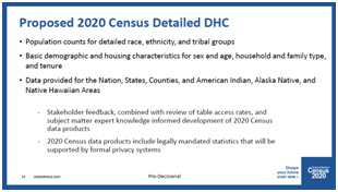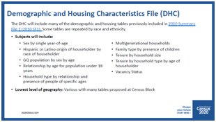 為了更頻繁地向公眾提供詳細信息,過去每十年收集一次數據的人口普查長表的數據每年通過美國社區調查 (ACS) 發布。人口普查局還發布其他數據產品,例如人口和住房特徵文件 (DHC) 和詳細的人口和住房特徵文件 (Detailed DHC)。