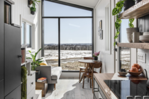 此款微型屋的內部面積為256平方英尺(23平方米)。它的起居室在一端是玻璃牆,充分利用自然光。這個空間裏有一張沙發,還有一張雙人小桌子。