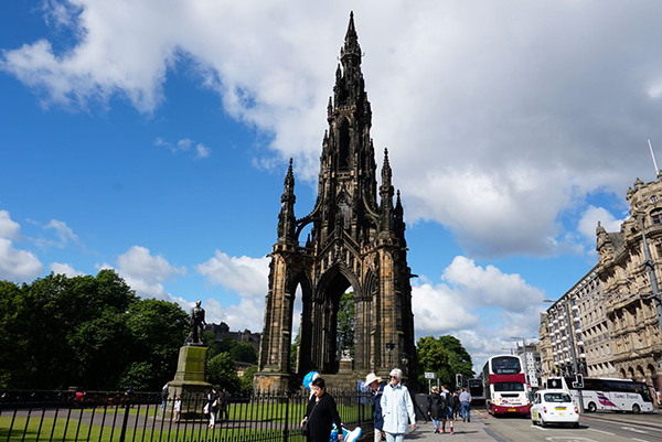 順著滑鐵盧大街往西走,下坡後便接上新城區的王子街。王子街往右是新城區,左邊是公園。公園裡有座維多利亞哥德式的巨大紀念碑乃是為了紀念蘇格蘭作家瓦特史考特(Walter Scott) 。他是蘇格蘭十八世紀末的歷史小說家兼詩人,史考特傳世的作品很多,搬上銀幕或拍成電視劇的亦不在少數。伊麗莎白泰勒與羅勃泰勒主演的名片《劫後英雄傳》即是改編自他的歷史小說艾凡赫(Ivanhoe) 。這部電影我是看過的,如今能站在原作者的紀念碑前頂禮膜拜,是意外,更有莫名的興奮。