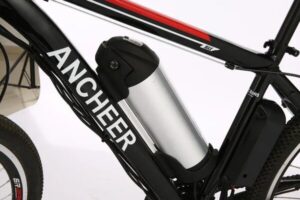 這個型號電動自行車使用水瓶形狀圓柱形電池,配26英寸車輪,並在下管上印有「Ancheer」字樣。