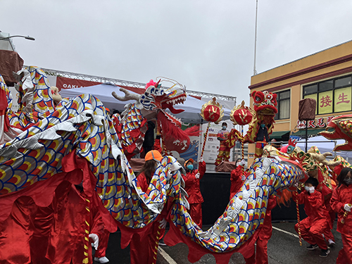 3日上午(雨天)街頭大舞台舉行冬至街會開幕式,奧克蘭華埠社區促進會主席莊錦鎮、副主席甄國輝、加州眾議員米婭·邦塔、新當選的阿拉米達縣參事譚蓮娜、新當選的阿拉米達縣地檢長帕麗斯、新當選奧克蘭市長盛桃的辦公室主任薇布、奧克蘭警察局副局長黃家華和比爾、東灣台山同鄉會主席馬作林、新當選的奧克蘭第四區市議員菊蘭妮、新當選的奧克蘭第六區市議員詹金斯、世界野生動物基金會資深總監皮爾森、長期家庭護理工會 區域總監露蓓 ·馬蒂尼茲、東灣交通局第二區當選董事簡·沃爾什等出席並講話及剪彩。