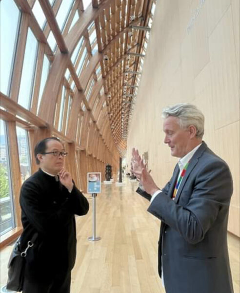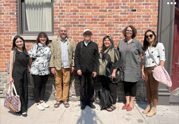 6月6日陳志誠校長一行人再前往加拿大多倫多,進一步展開展演交流與深化學術合作行程。此行仰賴駐多倫多臺北經濟文化辦事處陳錦玲處長、洪松暉組長、僑領林金益、黃煌裕、汪成源以及華裔藝術家陳瑋璇的協助,展開參訪拜會。首先,陳校長一行人參訪加拿大最重要的美術館—安大略省立美術館(Art Gallery of Ontario, AGO)拜會副館長兼首席策展人Julian Cox和總監Paola Poletto。AGO 的建築是由國際知名建築大師Frank Gehry設計的 Galleria Italia 和螺旋樓梯,是多倫多最具特色的建築之一。AGO十分強調社區參與和全年齡藝術教育,為各個年齡和背景的人提供設計工作坊、課程教案,其擁有大量的加拿大典藏藝術作品。Julian Cox副館長及Paola Poletto總監引領陳校長一行人參觀、了解其推廣教育機制,並洽談未來科技藝術平台連線之異地合作,期間雙方針對雙年展與藝術教育推廣交流合作事宜充分交流討論,進而探討如何進行國際資源連線、美術館大眾推廣教育方案與策展脈動等議題,期望未來達成協力夥伴關係。