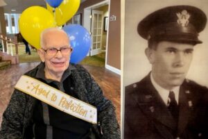 週二在Danville,一個聚會慶祝一位二戰老兵104歲生日,這位壽星獲贈城市鑰匙。