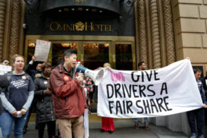 週一(4/1),在Uber和Lyft的San Francisco總部外面聚集了數十位網約車司機,要求更好的薪水和工作保障。
