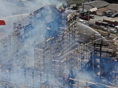 週一,Redwood City一在建建築燃起熊熊大火,迫使附近居民撤離。這幢建築有179個保障房單元。