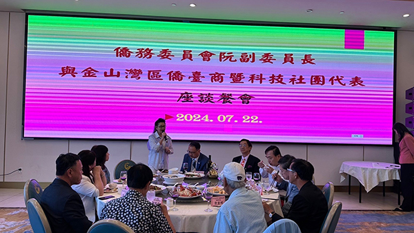僑務委員會阮昭雄於7月22日在金山灣區文教中心主任莊雅淑的陪同下,與金山灣區僑臺商會及多個科技社團代表進行座談餐會,深化臺灣與美國之間的商業與科技聯結。本次活動聚集了來自北加州臺灣工商會、舊金山灣區臺灣商會、世華工商婦女企管協會北加州分會、矽谷台美產業科技協會、北美臺灣工程師協會、全球玉山科技協會以及矽谷美華科技商會等多個團體的代表,共同探討如何通過雙邊合作推動臺灣科技產業的發展。