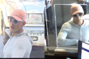 根據銀行員工的描述,嫌疑人是男子,頭戴淺粉色便帽,佩戴白色太陽鏡,身穿灰色拉鏈運動衫。