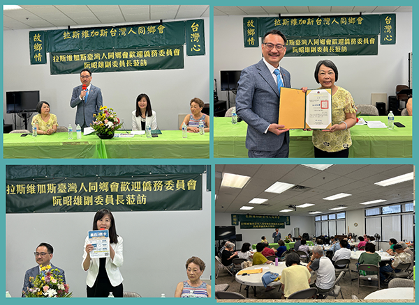 翌日阮昭雄偕同莊雅淑前往拉斯維加斯臺灣人同鄉會會所拜會,並與該會鄉親座談,對同鄉會凝聚臺灣鄉親,宣揚臺灣文化,在海外為臺灣發聲的熱忱與精神,表達感佩,會中阮昭雄代表僑委會頒發僑務顧問聘書予張愛惠,莊雅淑也說明僑委會i僑卡、僑務電子報及英語營等各項僑務服務訊息。
