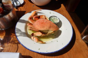 最後點了半隻鄧金斯螃蟹,來自旁邊 Bodega Bay 的螃蟹,我們選了熱的料理方式,鄧金斯螃蟹的蟹腿肉非常多又飽滿,沾上旁邊的奶油大蒜醬非常美味。