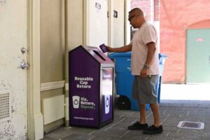 Petaluma市中心街道上,常會見到一些巨大的紫色回收箱。這是「Petaluma可重複使用杯計畫」的試點項目,如今結束了,但成果斐然,將有望延續下去。