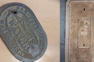 兩種類型公用設施井蓋被盜;一種是深色金屬/鑄鐵橢圓形井蓋,上面寫有「San Francisco Water Department」,另一種是白色或淺色矩形混凝土井蓋,上面寫有「SFPUC」。