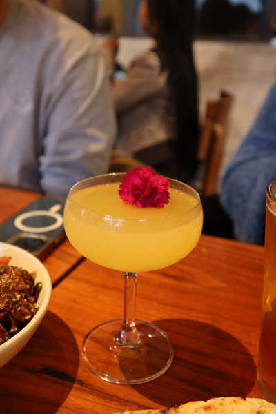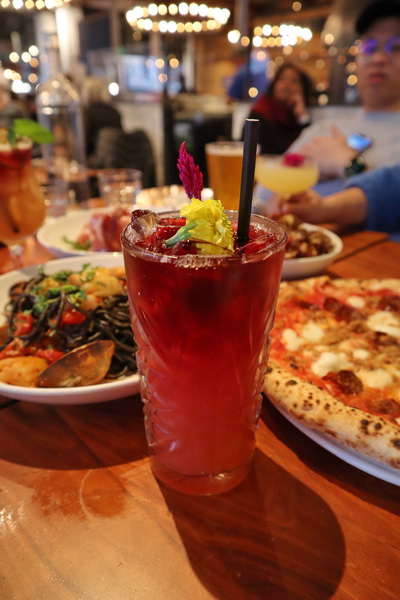 這杯是果味十足的無酒精調酒,加入朱瑾花萃取、草莓果汁、檸檬汁以及葡萄柚汽水,上面以花朵點綴。