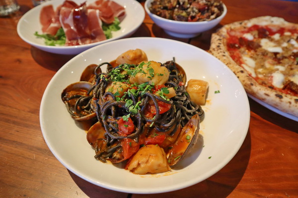 主餐我們點了一份義大利麵,選了黑色的墨魚細麵,裡面有超大的干貝、蛤蜊、烤大蒜,醬汁是微辣口感的番茄醬,整體非常豐富,吃起來也很過癮。
