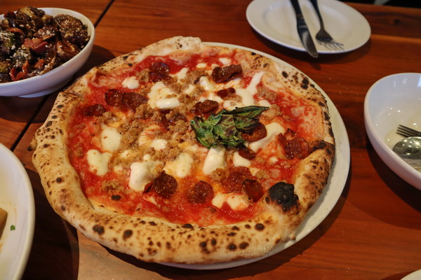 披薩我們選了服務生推薦的紅醬結合白醬披薩,以San Marzano 番茄醬搭配牛乳製作的莫扎瑞拉乳酪,上面有著西班牙辣火腿以及義大利香腸,還有羅勒提味,麵皮柔軟Q彈,切成四塊一人一片讓人唇齒留香。