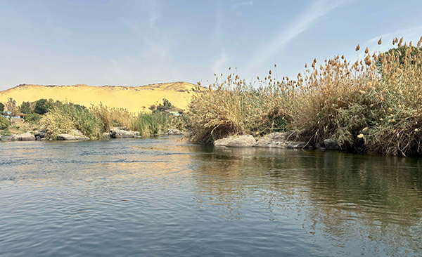 小船離開碼頭,努比亞孩童沒有追來。尼羅河西岸邊一片狄草黃花,間或見幾塊巨石突出水面,遠處是金黃色的沙山,沙漠與綠洲互映是尼羅河畔的特有風光。河水清澈異常,隨著陽光的折射及狄草的倒影映照出不同的色彩,橙、黃、綠、藍、青,非常美麗。
