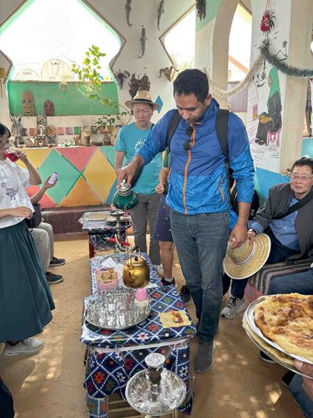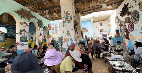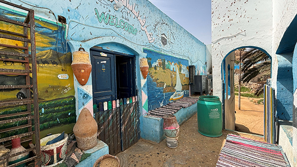 體驗過騎駱駝,我們便去造訪奴比亞人家。這是棟以淺藍色為底的彩繪屋宇,有著布置古雅的中庭。牆上掛著蟲魚的標本,架上放著古樸的手工藝品,牆邊的鐵桶中養著鱷魚,處處表現出努比亞人的本色。努比亞人崇拜鱷魚,豢養鱷魚一方面為了崇拜,另方面也為了吸引觀光客。努比亞人有好客熱情的傳統,主人招待我們喝洛神花茶,配上薄餅、酥糖等茶點,滿足了我們對奴比亞人生活特色的好奇心。