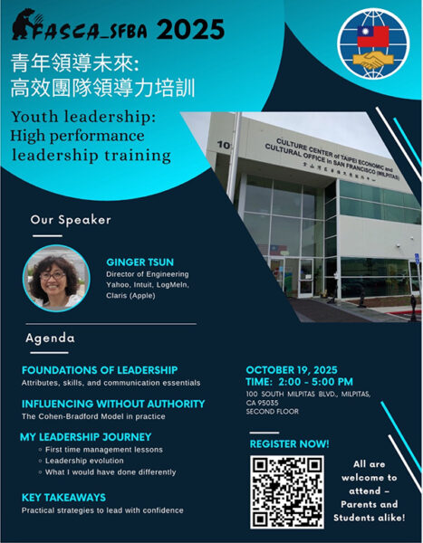 面對多變學校環境與全球挑戰,青年如何具備領導思維與團隊整合能力,成為關鍵課題,由海外青年文化大使協會金山灣區分會主辦「青年領航未來:高效團隊領導力培訓」論壇,以提升青年團隊領導力為核心,將於2025年10月19日(星期日)下午2時至下午5時,在金山灣區文教中心(100 S. Milpitas Blvd., Milpitas, CA 95035)舉行,誠摯邀請大家踴躍參與。