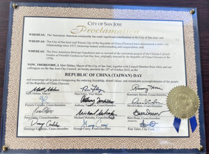 In a joint statement, Mayor Matt Mahan, Councilmember Peter Ortiz, and all members of the San Jose City Council officially declared October 25, 2025, as “Republic of China (Taiwan) Day,” recognizing the significant contributions of the Taiwanese-American community to the city, the lasting sister-city relationship between San Jose and Tainan established in 1977, and the efforts of the Chinese American Historical Foundation in restoring the Chinese Cultural Garden at Overfelt Gardens Park—originally built in the 1970s with support from the Republic of China (Taiwan).