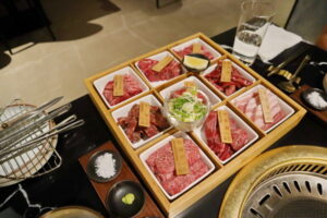 Beef Tongue:美國和牛等級的牛舌搭配檸檬;Striploin:紐約客牛排;Flat Iron:平鐵牛排;Outside Skirt:加入胡椒醬醃漬過的外裙肉;Galbi:平時我最愛的韓式牛小排;Rib Finger Jumuluck:醃漬過的牛肋排;Jin Galbi:美國和牛等級的無骨牛小排;Ribeye: 美國和牛等級的肋眼牛排;Pork:三層豬五花;Sliced Oxtail:搭配醬油醃製的牛尾。