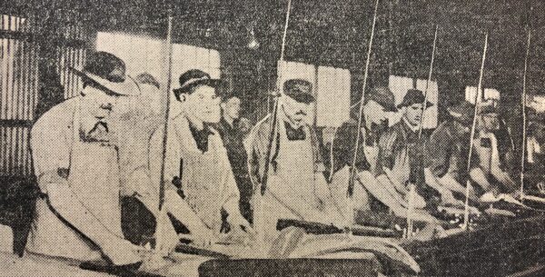 圖解: 阿拉斯加想要什麼。這樣一排罐頭廠的白人工人就是阿拉斯加知名人士所要求的,用以取代現在處理包裝鮭魚的華人幫。