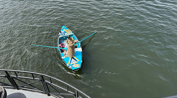 遊輪停妥後,只見尼羅河上有數條小船在河面上穿梭,船家一面搖櫓一面叫賣。船上乘客好奇的站在甲板上扶著欄杆觀看。只見船家在小船上展示商品,若有客人看中願意買下,船家便將貨品綁在一個小籃子中丟上船來,客人再將錢放入籃中緩緩垂下小船。這樣的叫賣方式很是有趣,討價還價聲中,船家倒也做了不少生意。船上船下一片笑鬧聲,圍觀的人看得也都覺很開心。