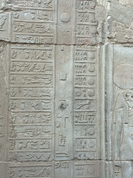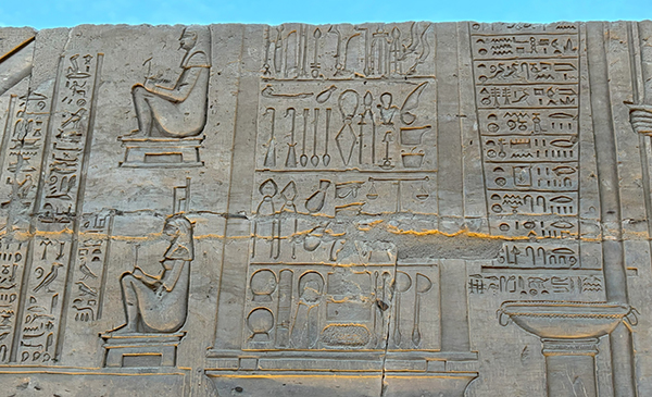神殿中的一面牆上刻著古埃及的太陽曆,據說這是人類史上最早的日曆,而且日曆上還刻有祭祀活動的日程表。日曆上分三個季節,一季四個月,從尼羅河洪水季節、播種季到豐收季。一年十二個月,一個月三十天,另外的五天則是五大神明的節慶祭祀日,如此一年三百六十五天的不斷循環。日曆上的一豎代表一日,小拱門代表十。依據豎劃,可以清楚地算出幾號,例如兩豎加一個小拱門就是十二號。但豎劃只畫到八;九則是以圓形中間加一橫為代表,若加兩個拱門就是二十九。第十天,也不是以豎劃計算,而是以圖案代替。譬如豐收季結束時,那個月的第三十天就畫一個稻禾圖案作為代表。每一天的旁邊皆有兩幅象形圖案,可能像我國的農民曆一樣,表示那一天可以做甚麼樣的事及該做的祭祀活動。雖然看不懂古埃及的象形文字,也不知標示著怎樣的祭祀活動,但依據豎劃及拱門等圖案,不難算出幾月幾號。