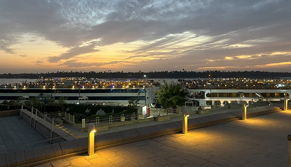 離開神廟時紅日已西沉,一抹殘霞浮在尼羅河西岸。居高臨下,遙看尼羅河上停滿了一艘艘的遊船,船上燈火輝煌,迎接著回船的遊客們。