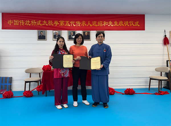 活動現場,遲紹和師父喜收三位精英徒弟:趙小茜,從2016年來美國,由於身體處於亞健康狀態,所以選擇傳統楊氏太極拳,作為修身、養生、防身為一體的運動來調養。她2021年跟隨遲紹和師父學拳,拳技突飛猛進,2023年至2025年,連續三屆榮獲北加州華體會太極拳女子總冠軍和泛美武術錦標女子組冠軍和季軍;鄧向陽於2004年開始練習太極拳,24式簡化太極拳,陳式老架陳式小架和陳氏混元太極拳。2022年他開始跟遲紹和老師系統練習楊氏太極拳、太極51劍,太極13刀及太極推手至今,他在2023~25年加州參加各項武術比賽中獲得7個全能冠軍及20多枚金牌;張玥鈴現任互聯網公司工程總監,她注重身心修養,於今 年清明期間因調理身體初識太極,跟隨楊式太極拳傳人遲紹和學習楊澄甫式太極拳與八段錦,深受其“形理並重、以道領拳”的教學理念影響,逐漸體悟太極之道與為人之道。本次收徒儀式,標誌著太極拳在美國加州進一步扎根。