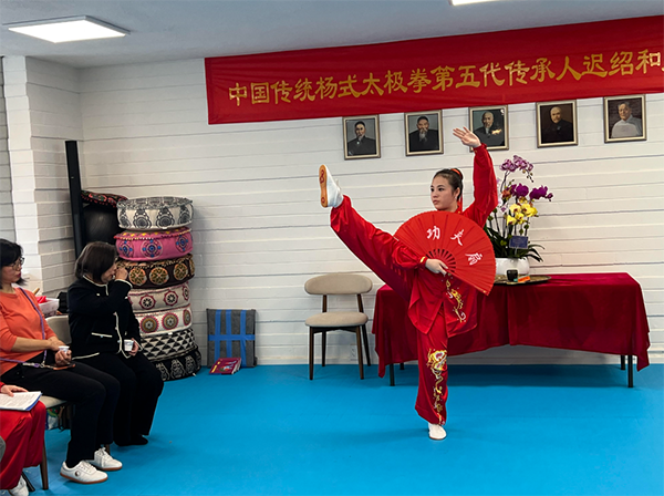 跟隨楊式太極拳傳承人遲紹和系統習練楊式太極拳、太極劍、太極刀與太極推手等培訓與教學,這次也到現場表演了功夫扇,剛柔並濟,展示了獨特魅力。