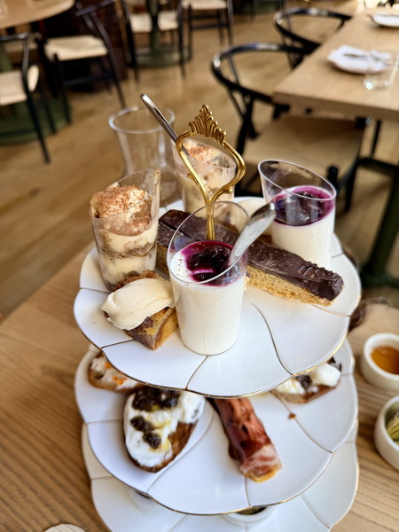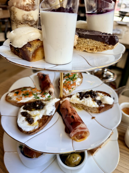 中間層是鹹味的小點,有著擺在烤麵包上的布拉塔起司,上面淋上黑松露蜂蜜與韭菜;一根帕爾瑪火腿捲,包著水梨與戈爾根佐拉奶酪;魚子醬夏巴塔麵包,上面有一球法式酸奶油與檸檬皮。