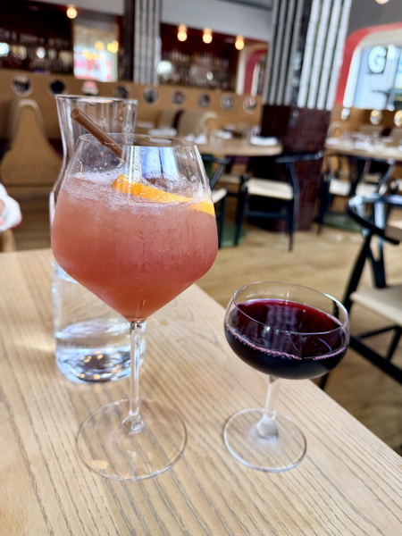 首先服務生詢問我們想要白氣泡酒還是紅氣泡酒,我選了義大利紅氣泡酒 Lambrusco,來自北義大利的 Emilia-Romagna 葡萄酒產區的 Cantina di S. Croce 酒莊,有著櫻桃、李子、以及覆盆子的香味,是相對比較甜的氣泡酒。朋友請服務生特製了一款無酒精飲品,看起來非常清爽可口。