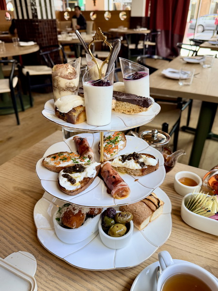 中間層是鹹味的小點,有著擺在烤麵包上的布拉塔起司,上面淋上黑松露蜂蜜與韭菜;一根帕爾瑪火腿捲,包著水梨與戈爾根佐拉奶酪;魚子醬夏巴塔麵包,上面有一球法式酸奶油與檸檬皮。