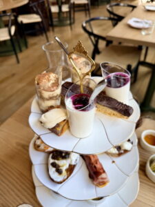 三層下午茶的最上層是精緻的迷你甜點,有著迷你提拉米蘇杯,加入了可可粉與金箔;杏仁開心果餅乾,上面有一層黑巧克力,口感硬且脆脆的;義大利水果麵包布丁,擠上馬斯卡彭奶油以及柑橘;以及黑櫻桃義式奶凍,裡面還有柳丁皮以及壓碎的杏仁餅。
