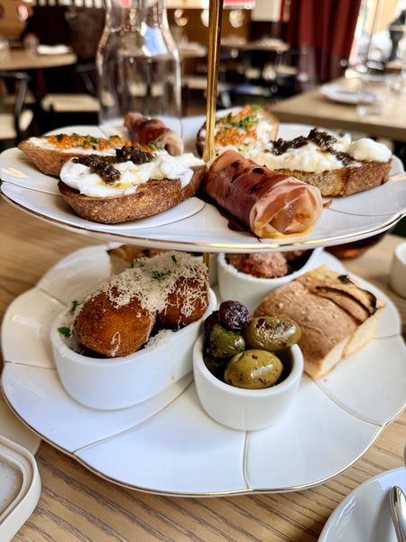 最下層是熱食,溫熱的迷迭香佛卡夏麵包,上面淋上橄欖油與海鹽;西西里意式炸飯球裹著番紅花燉飯,中間是莫扎瑞拉乳酪;意式小牛肉丸,淋上了聖馬扎諾番茄番茄醬,另外還有一小碗西西里醃漬橄欖,有著柑橘與香草的味道。
