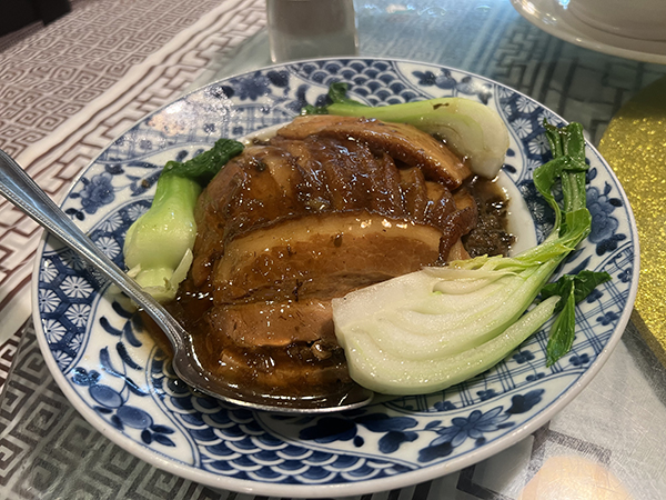 - 冰糖元蹄: 這道菜展現了極致的燉煮功夫。元蹄被燉得色澤紅亮、皮Q肉嫩,濃稠的芡汁帶著冰糖特有的琥珀光澤。輕輕一撥便骨肉分離,滿滿的膠原蛋白伴隨著醇厚醬香,是桌上最霸氣的靈魂角色。