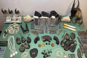 本月早些時候,在Fresno縣的一次打擊野生動物販運行動中,加州魚類和野生動物部(CDFW)查獲象鼻、犀牛角和數百個其他非法偷獵動物的部位。