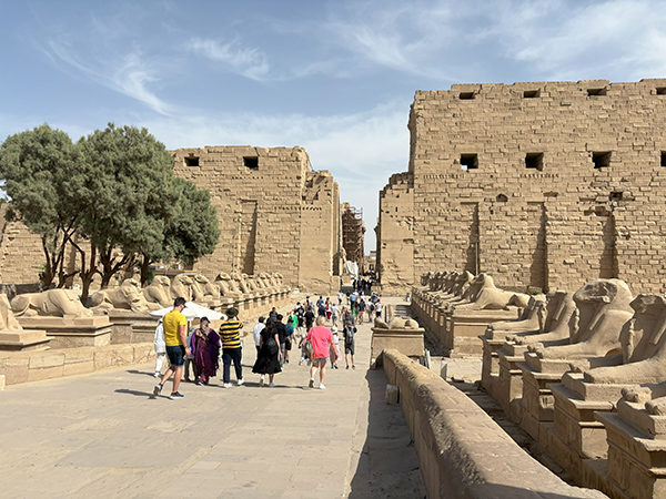 從卡納克神廟的入口還需走好長一段路才到神廟的前院,前院寬敞的石板大道兩旁立著一隻隻的公羊雕像,公羊大道十分壯觀。古埃及人相信阿蒙神喜歡附在公羊身上,所以視公羊為聖羊。