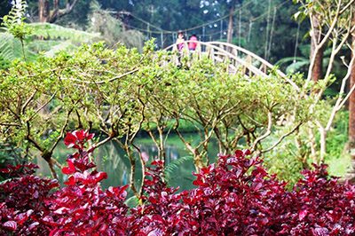 群山環抱中,一汪水光瀲灩的碧綠池水,一座拱形竹吊橋跨過湖面,與水中倒影相連,形成橄欖似的形狀。是怎樣的匠心,架起了這座美麗又原始的吊橋?波平如鏡,花影樹影倒映如幻,美得動人心弦。