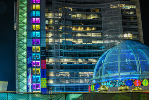 Description: 在 Super Bowl LX 前夜,San Jose City Hall 以繽紛燈光迎接全城的期待,讓行政中心成為賽事週最亮的節點。