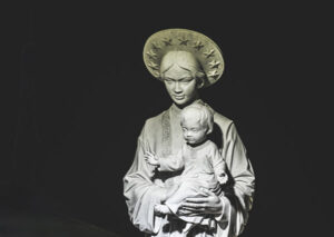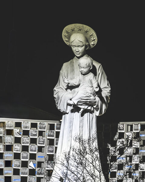 作品描述: 於聖荷西市政廳附近拍攝超級盃街區活動夜景時,在人聲鼎沸與震耳欲聾的重金屬搖滾樂聲中,捕捉到這座靜默佇立的聖母像。聖母頭戴象徵優雅與敬意的越南傳統頭飾「khăn đóng」,在狂熱歡騰的節慶氛圍裡,更顯莊重與溫柔。喧囂與寧靜、流行文化與宗教象徵在畫面中並置,形成鮮明對照,映照出信仰跨越語言與族群、存在於各種文化場景之中的深刻意涵。