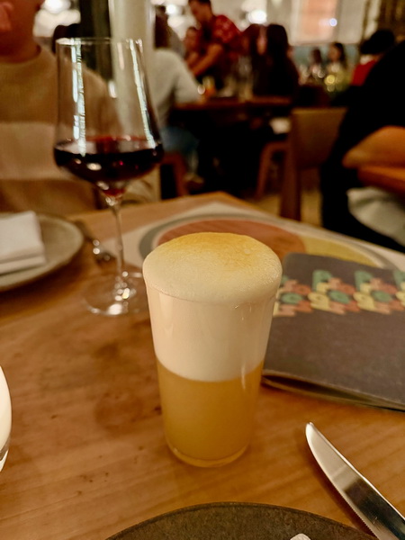 入座之後我點了一杯調酒,這杯加入琴酒、紫蘇、柑橘、煙燻烏龍、雪莉酒、蘇打水、蛋白,有一股淡淡的茶香,上面是綿密有著紫蘇香氣的泡沫。